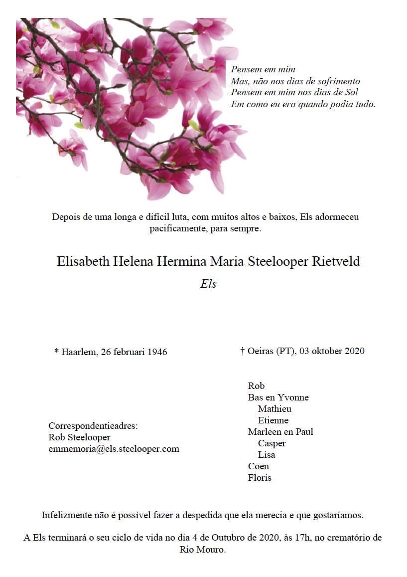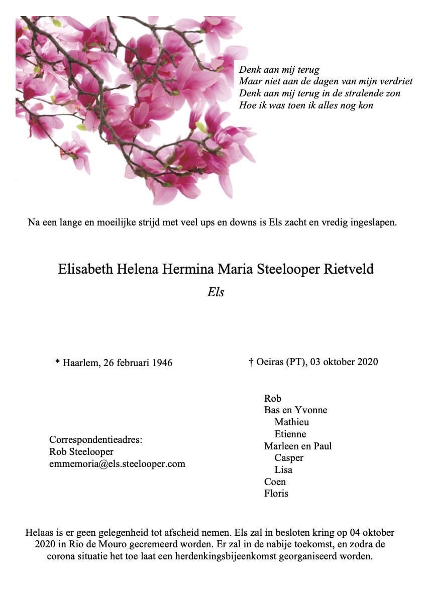 Weinig nieuws en veranderingen maken dat er weinig updates komen. Mama is nog steeds stabiel en geniet van haar Portugal. Ze heeft wel veel pijn, echter red ze het vaak met de voorgeschreven morfine. Soms is de pijn echter veel te veel om te dempen met de morfine, die dagen ligt ze dan vooral op bed. Op de goede dagen zit ze het liefst in het zonnetje op het terras.. en ik kan haar geen ongelijk geven..
